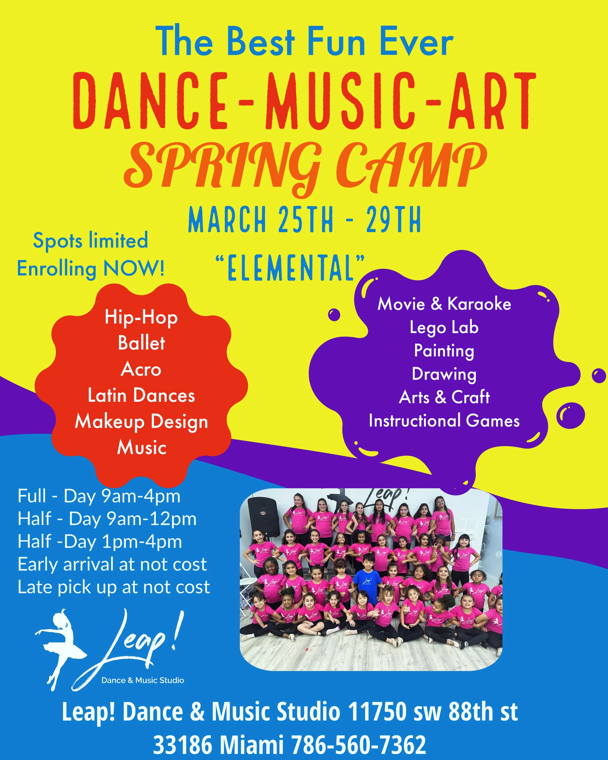 Campers will enjoy different dance styles, music classes, and arts & crafts projects. Art show and Dance showcase on Friday.